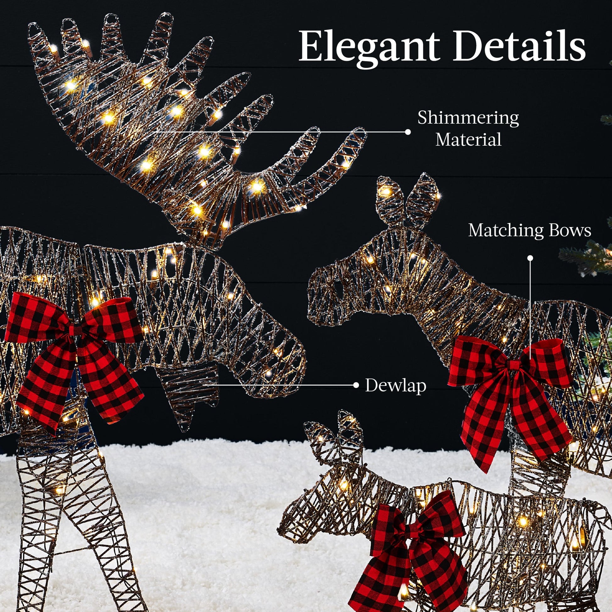 • ELEGANT DETAILS: Celebrate the season with a heartwarming snapshot of a moose family, intricately designed with their matching, shimmering bows and fabric