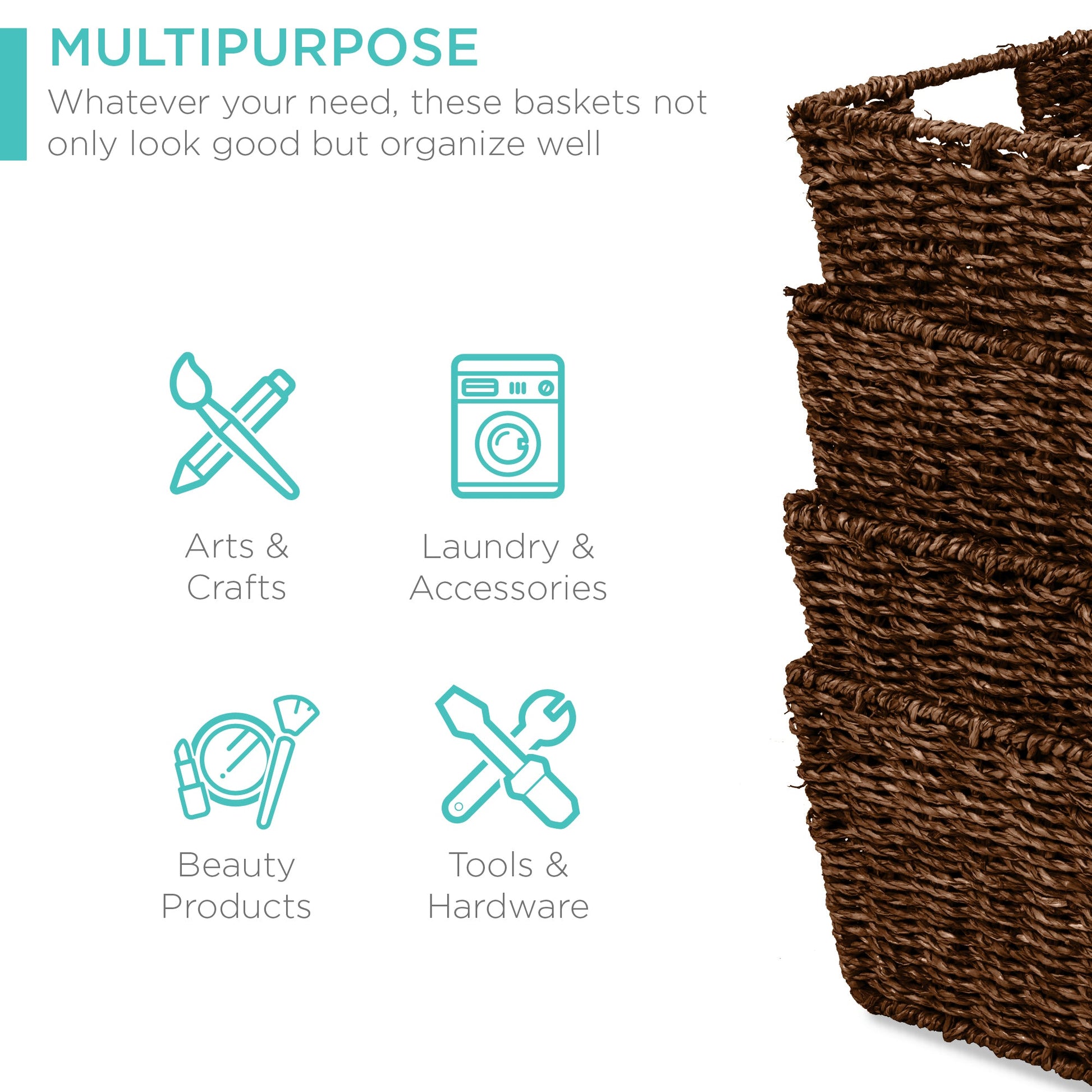 Set of 4 Seagrass Storage Tote Baskets, Laundry Organizer w/ Insert Handles