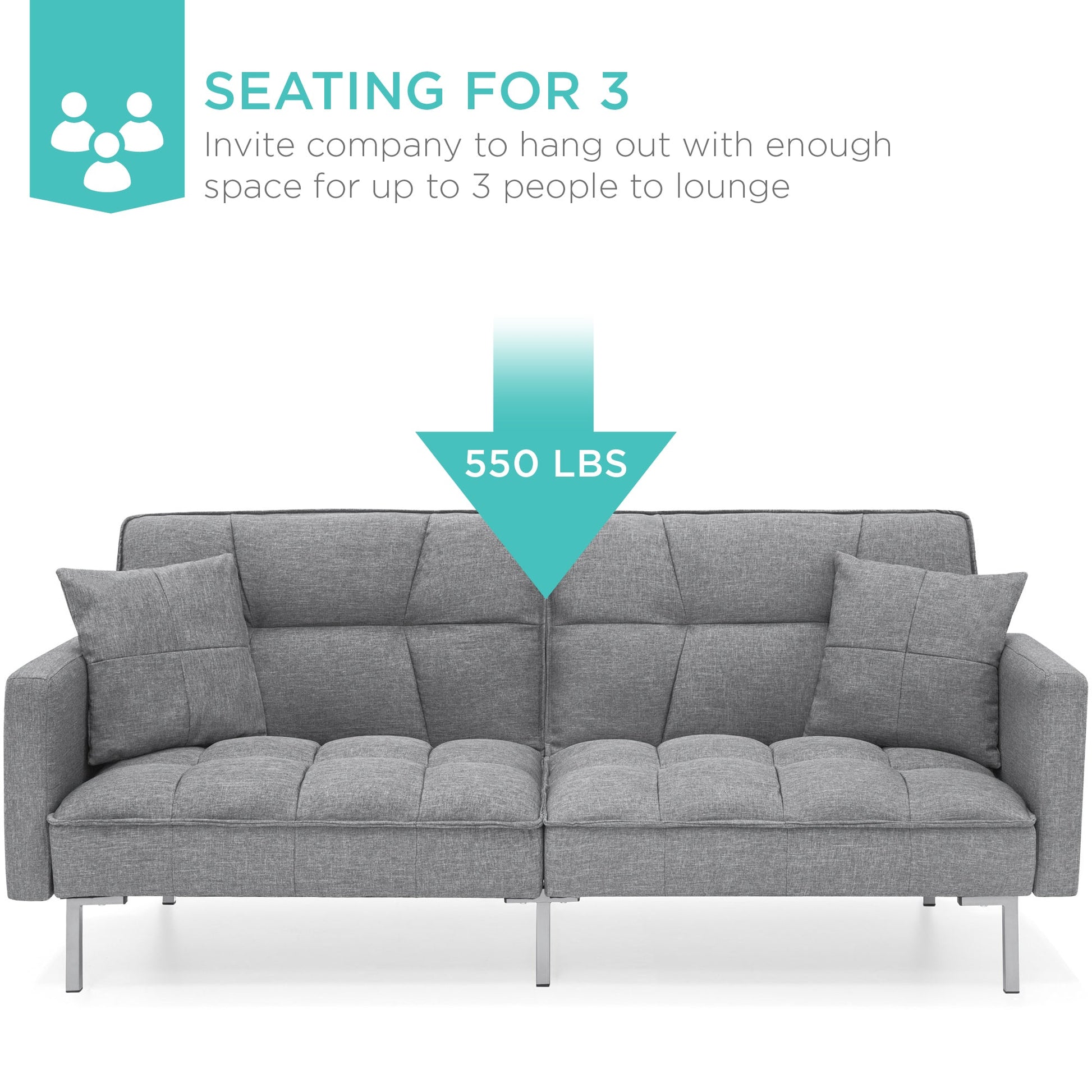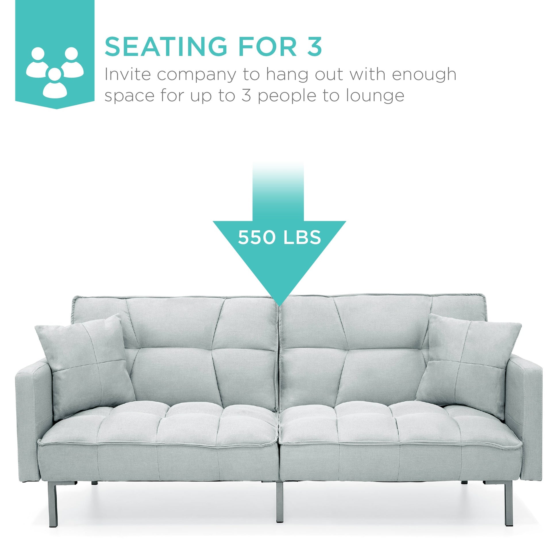 Convertible Linen Tufted Futon w/ 2 Plush Pillows, Split-Back Design
