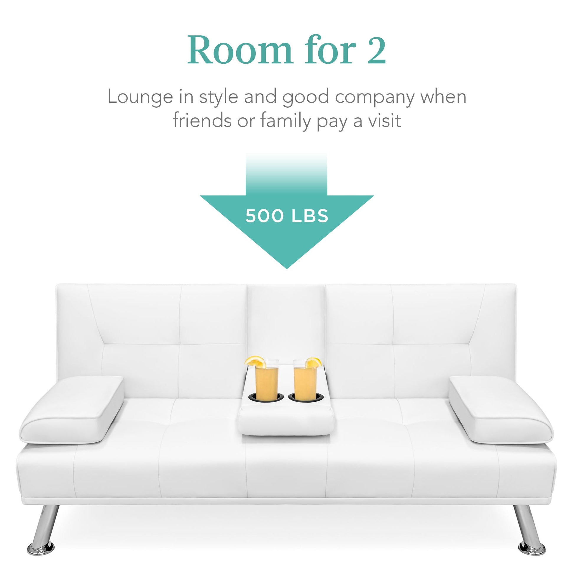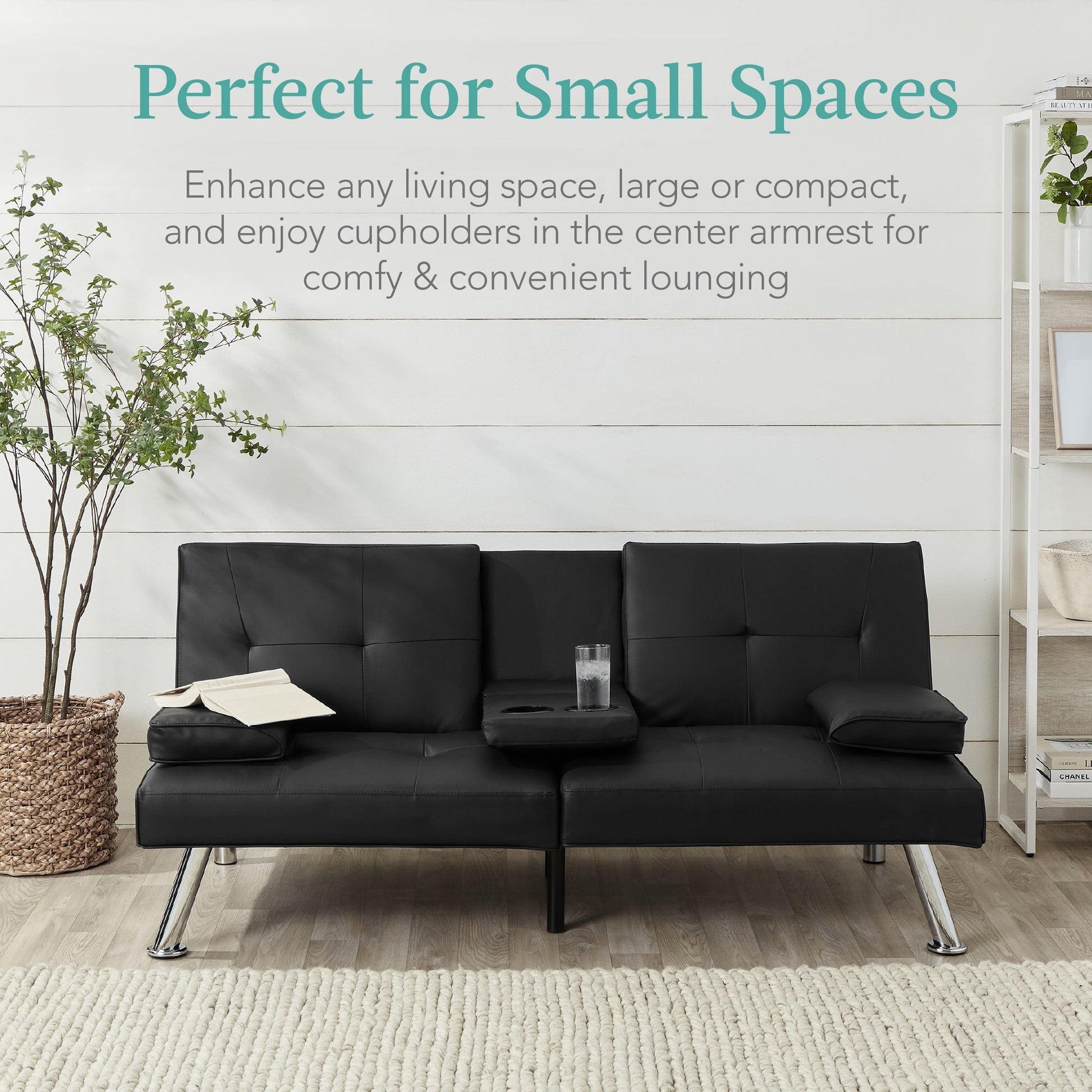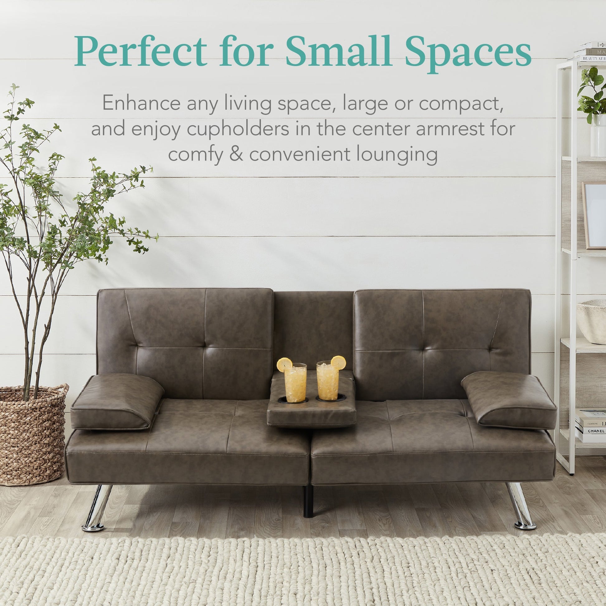 Faux Leather Upholstered Convertible Sofa Bed Futon w/ 2 Cupholders