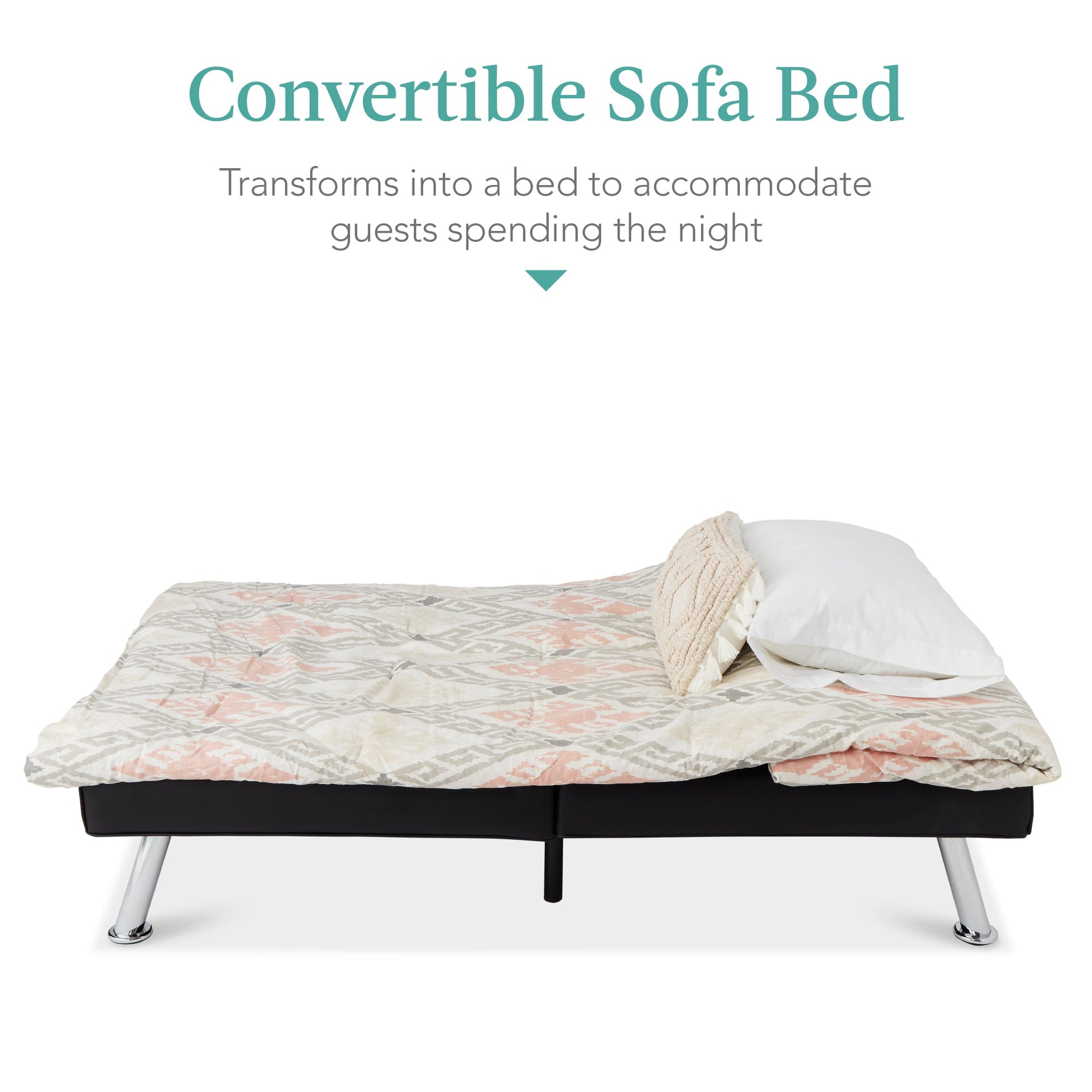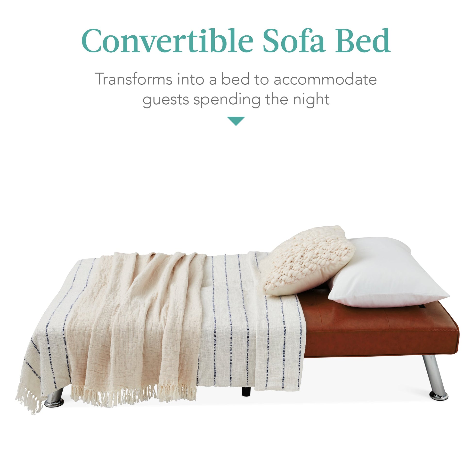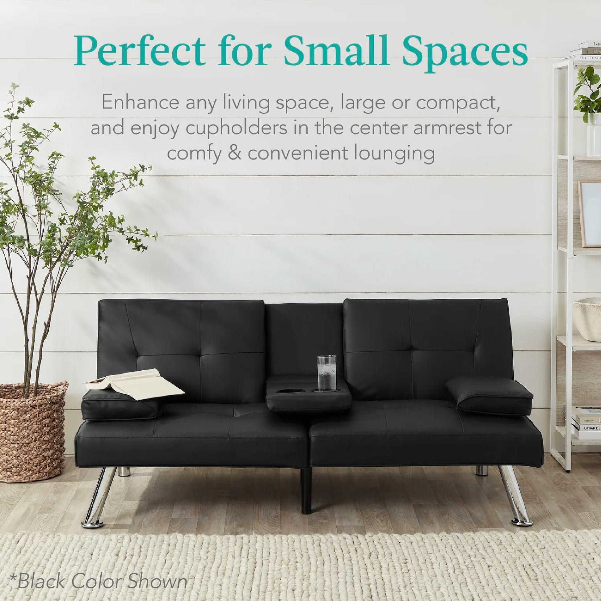 Faux Leather Upholstered Convertible Sofa Bed Futon w/ 2 Cupholders