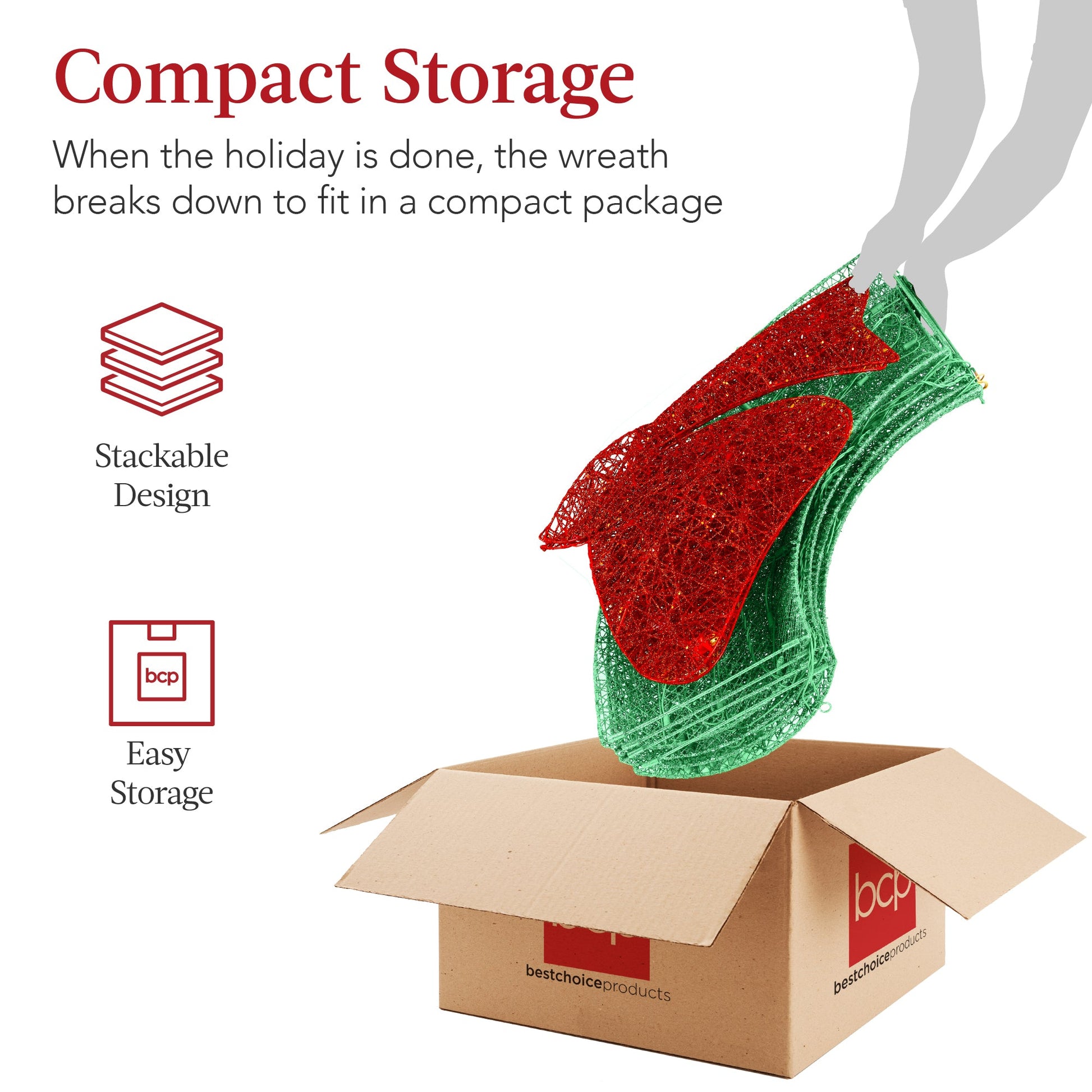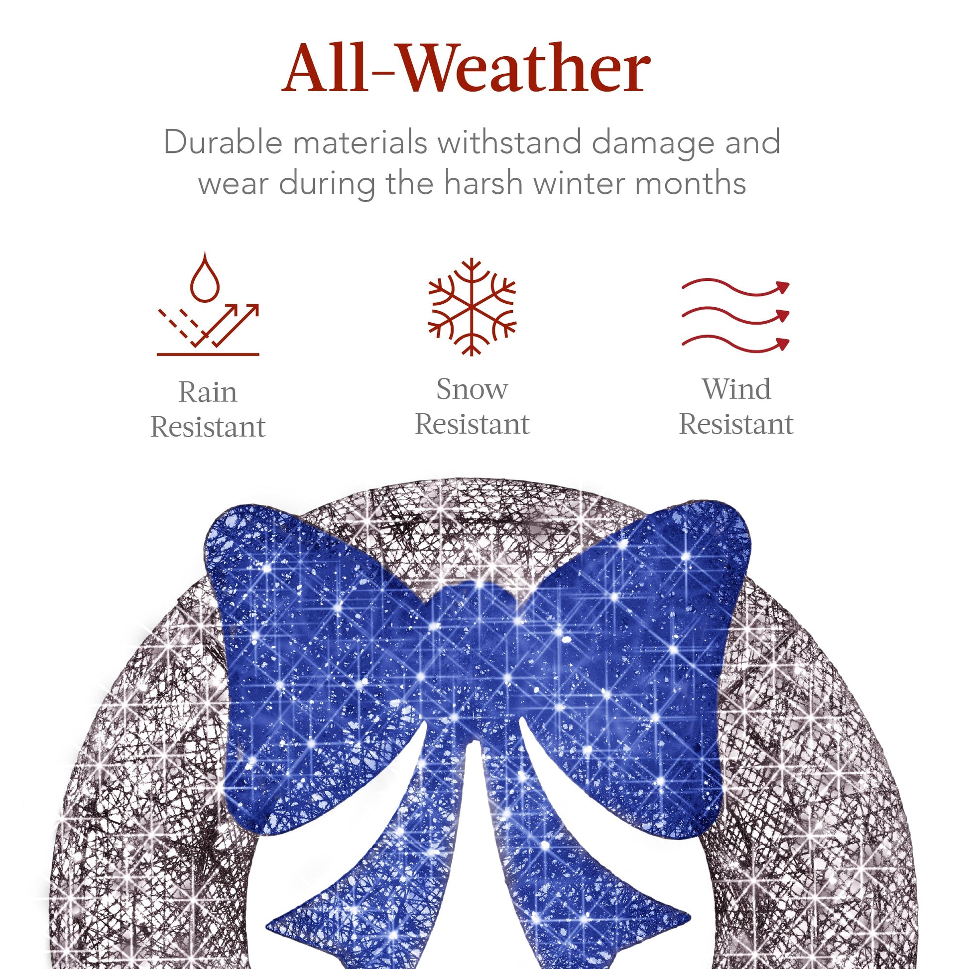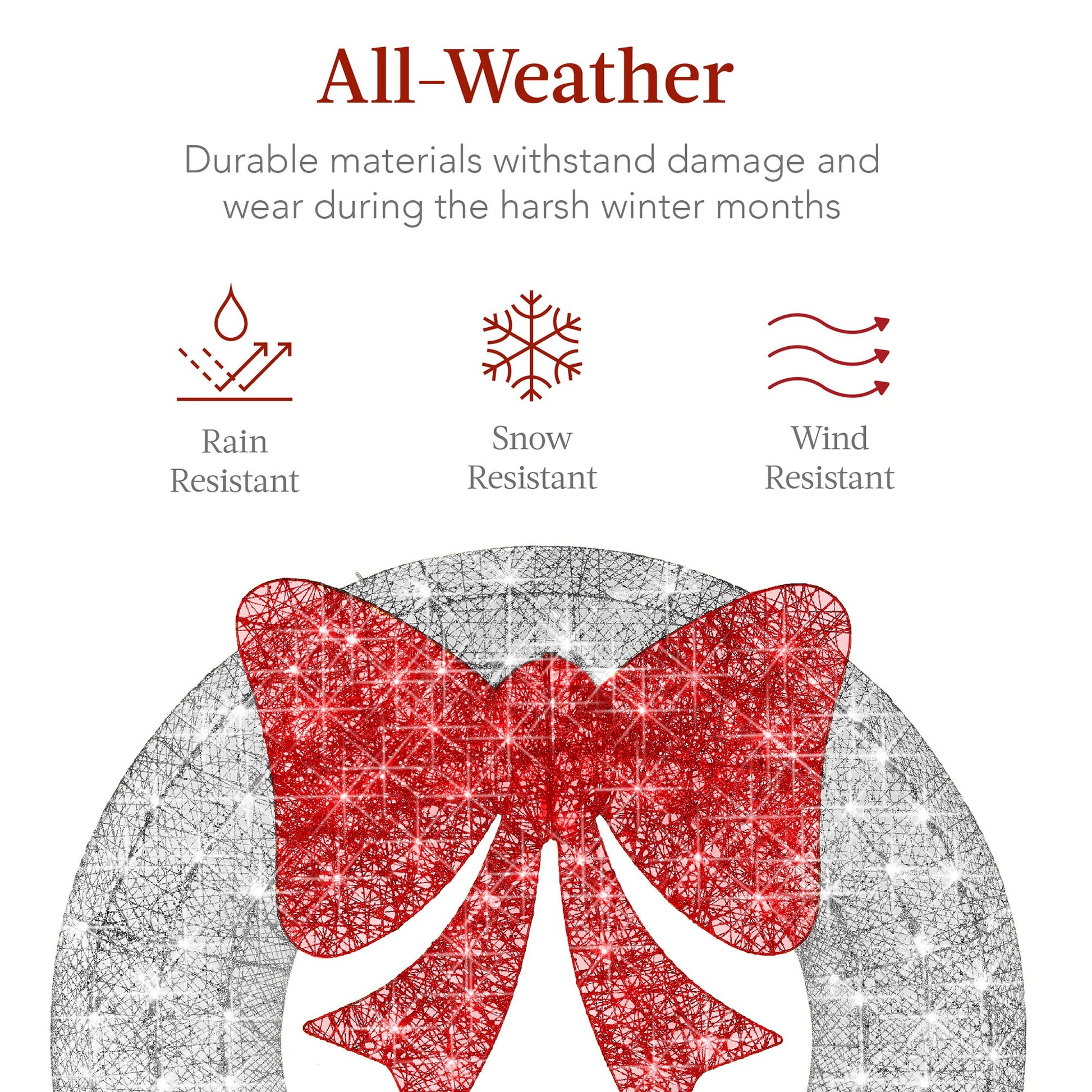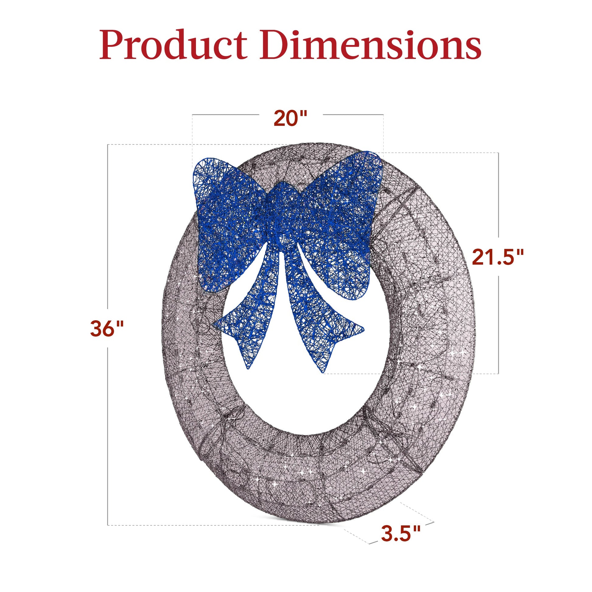 Pre-Lit Outdoor Christmas Wreath, LED Metal Holiday Decor w/ Bow - 36in