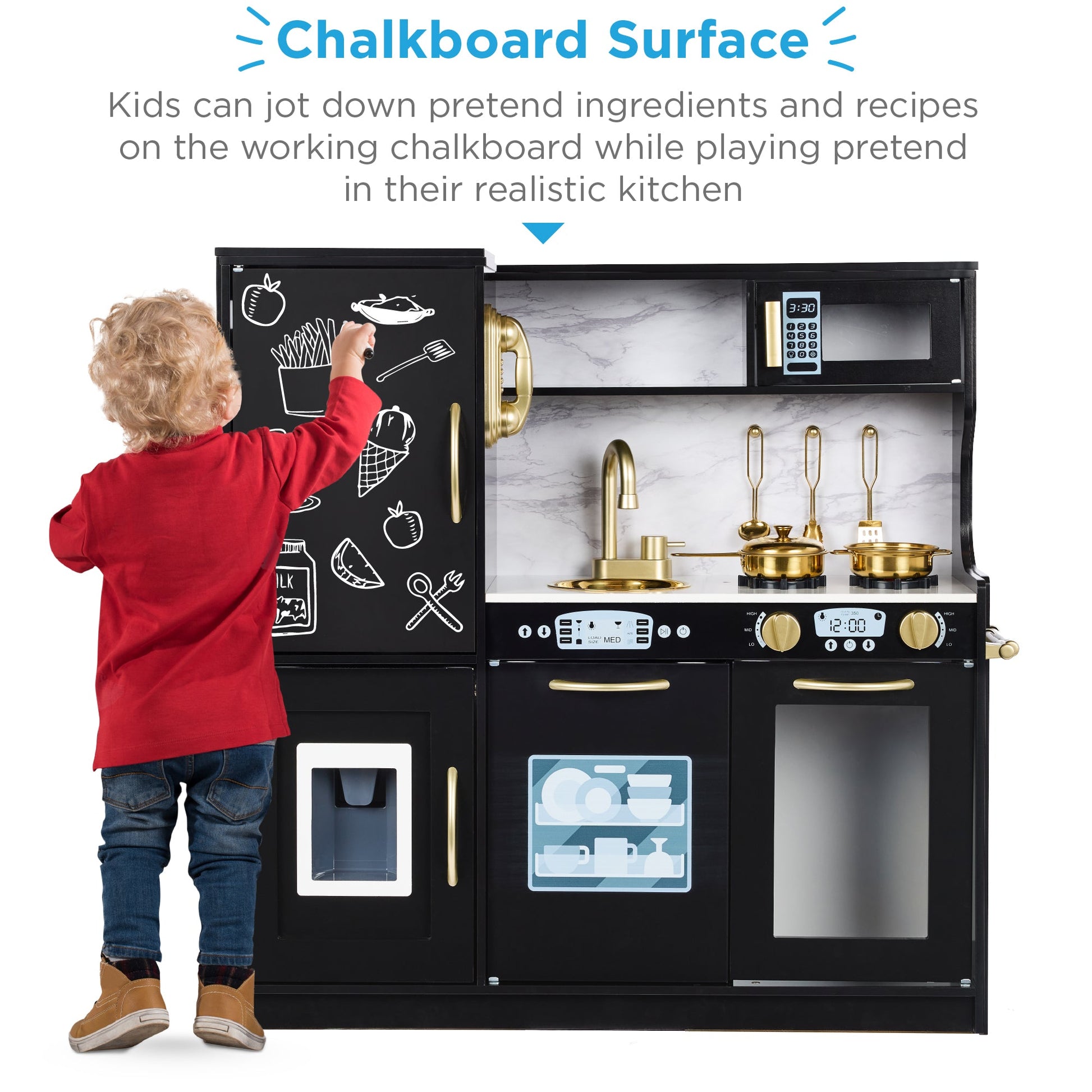 CHALKBOARD SURFACE: Little chefs can jot down notes on the chalkboard surface as they play with this large set made with a realistic design that mimics a real kitchen, designed for their size, and have fun playing with the ice maker, microwave, phone