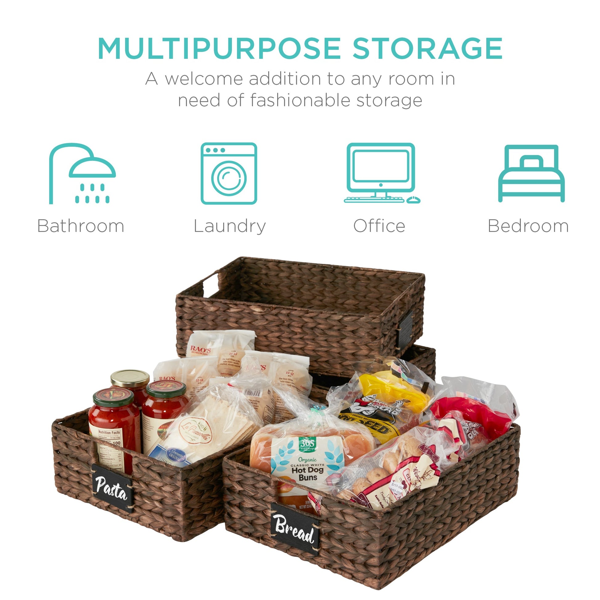 Set of 4 Water Hyacinth Pantry Baskets w/ Chalkboard, Chalk Marker